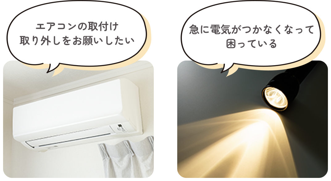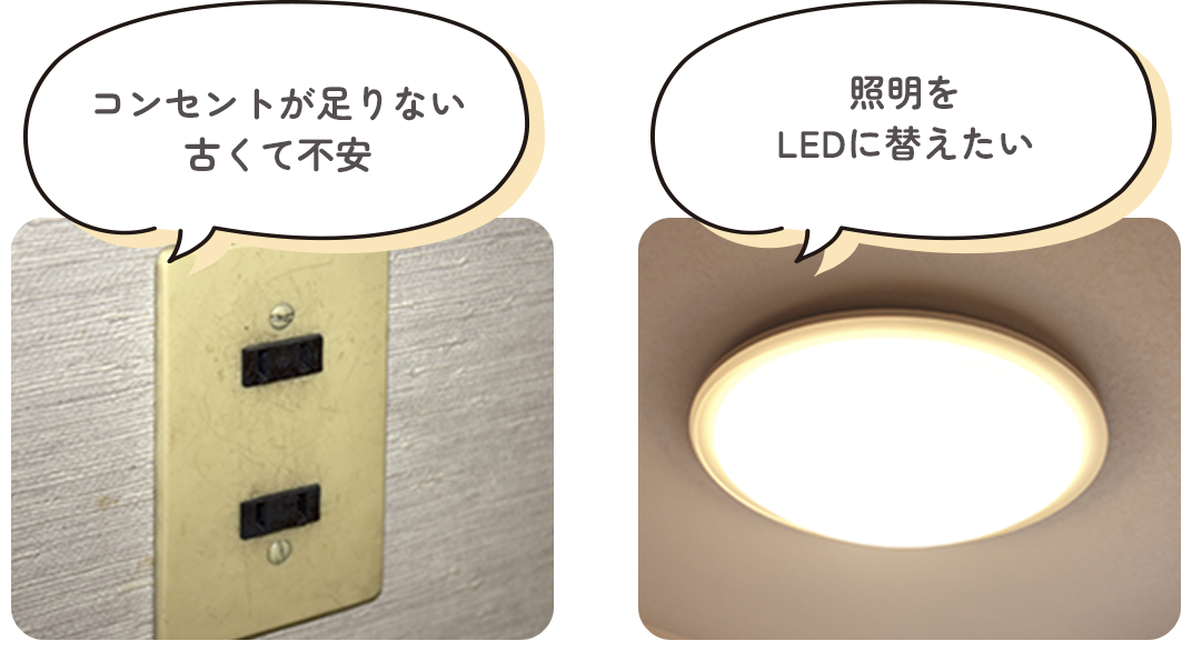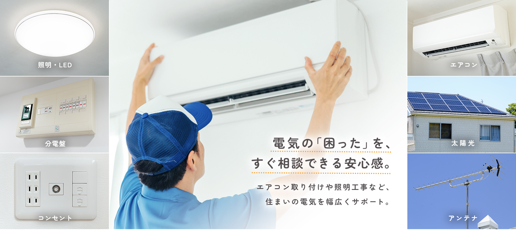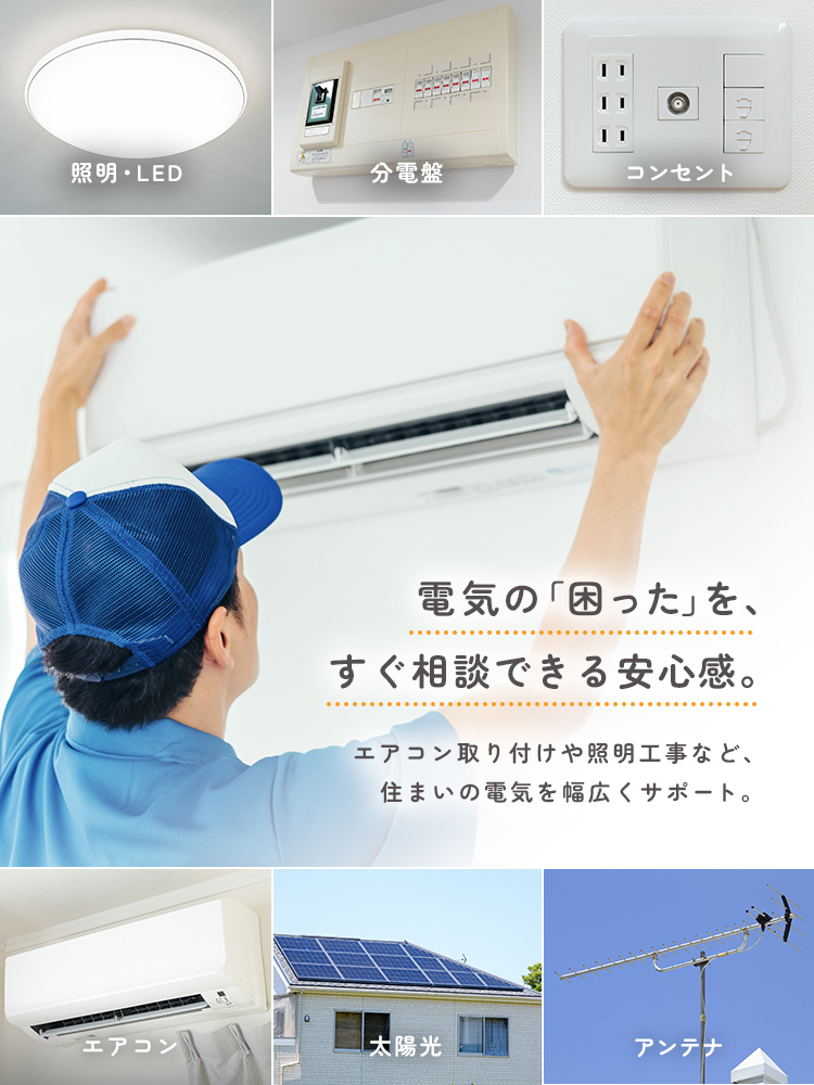 電気工事・照明・エアコン工事まで、住まいの電気をまとめて相談できます。